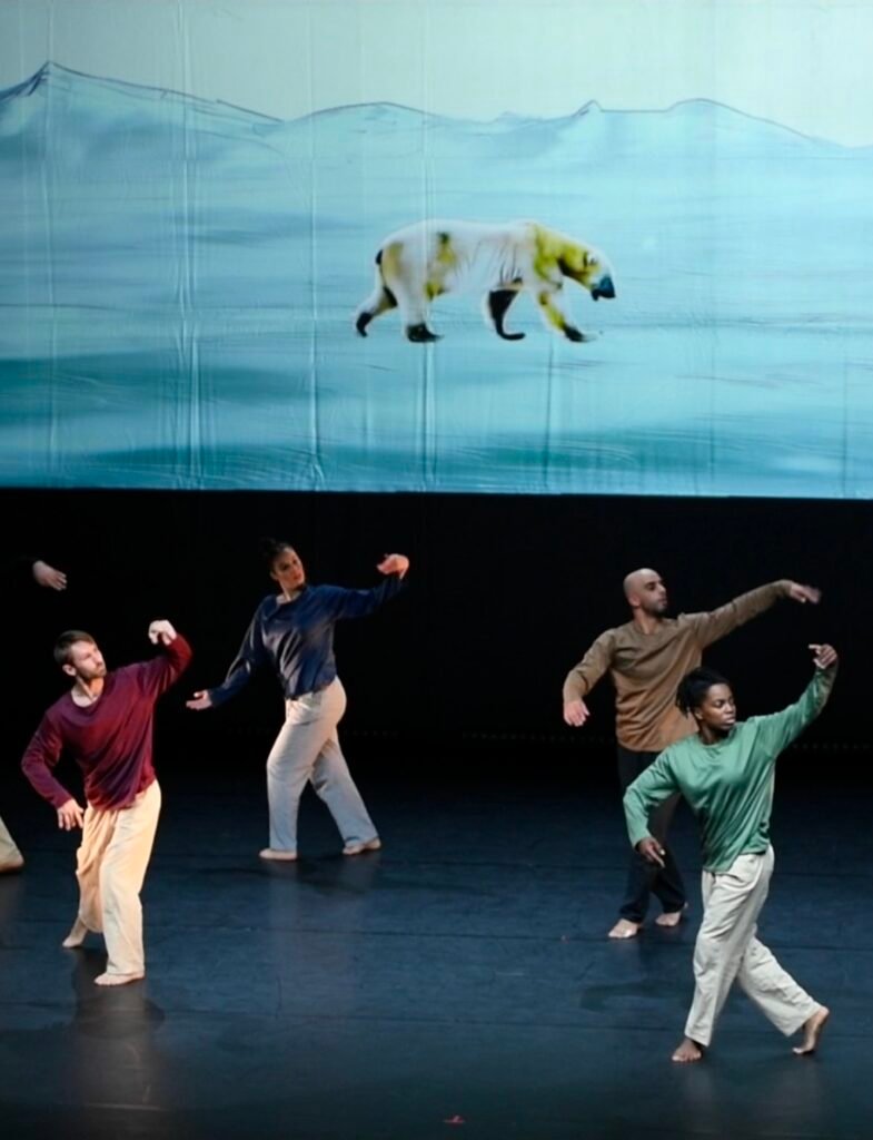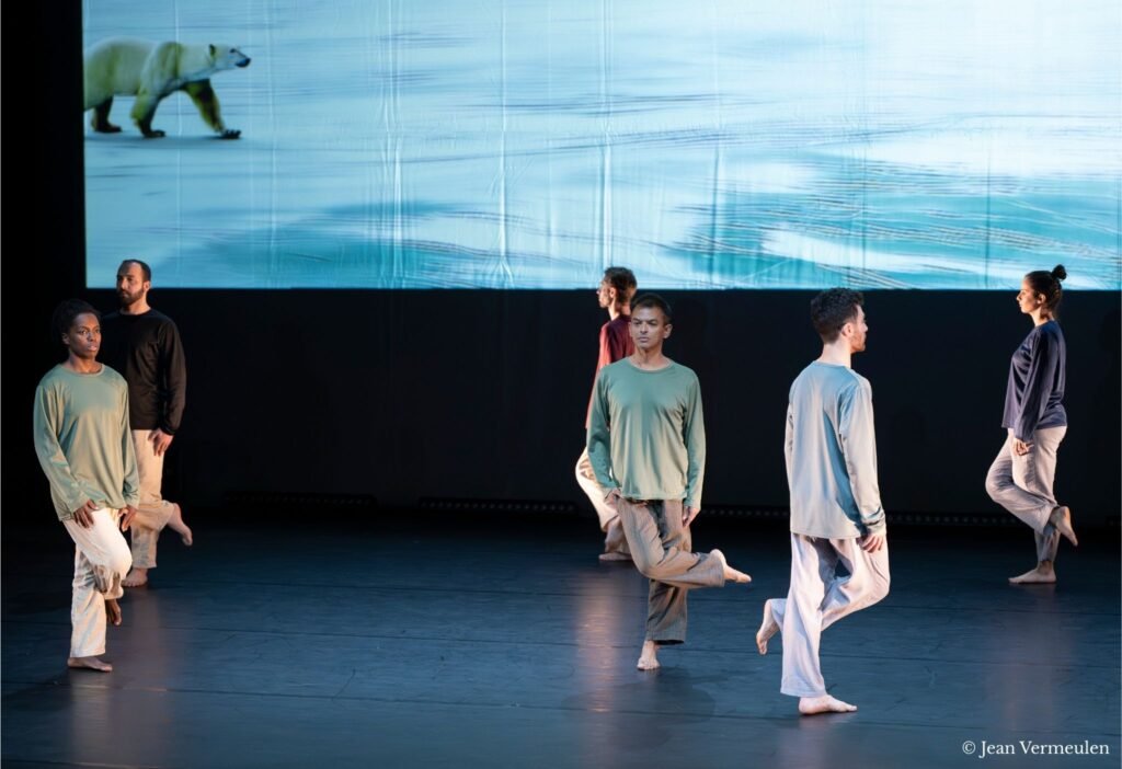 La pièce chorégraphique s’appuie sur la projection immersive d’un ours blanc marchant sur la banquise, au rythme intégral du Boléro de Ravel.